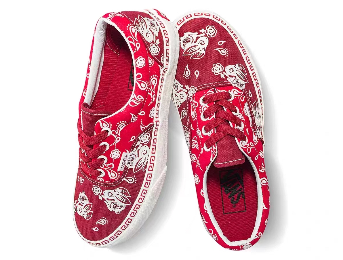 Vans兔年生肖联名Era帆布鞋以代表新年的红色为主色调,内衬鞋垫也特别采用红色。设计上,鞋面上有兔子和腰果花图案,呼应“兔年”的主题。