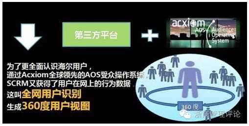 海尔利用SCRM把分散在不同系统中用户数据融合到一起,有销售数据、售后数据、会员注册数据等。通过数据清洗,识别出每个海尔用户的姓名、电话、年龄、住址、邮箱、产品。另外,海尔的SCRM还获得了用户在网上的行为数据,进行全网用户识别,生成360度用户视图,针对每一个海尔用户的特点、爱好和生活习惯,进行用户标签,根据用户标签进一步将用户进行聚类。