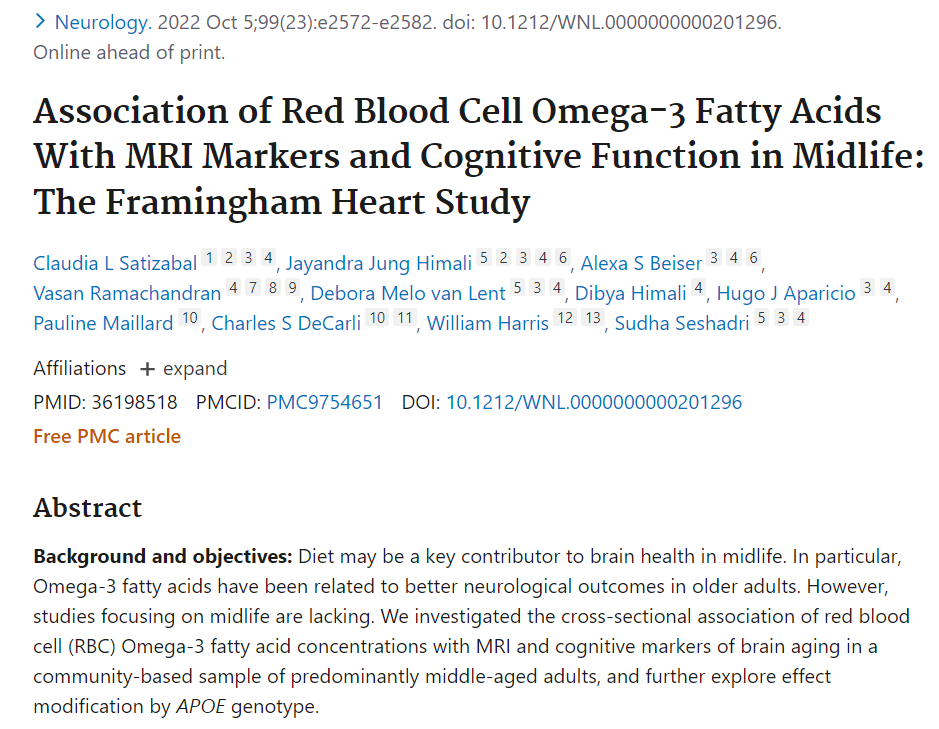 [7] Satizabal CL, Himali JJ, Beiser AS, Ramachandran V, Melo van Lent D, Himali D, Aparicio HJ, Maillard P, DeCarli CS, Harris W, Seshadri S. Association of Red Blood Cell Omega-3 Fatty Acids With MRI Markers and Cognitive Function in Midlife: The Framingham Heart Study. Neurology. 2022 Oct 5;99(23):e2572–82. doi: 10.1212/WNL.0000000000201296. Epub ahead of print. PMID: 36198518; PMCID: PMC9754651.
