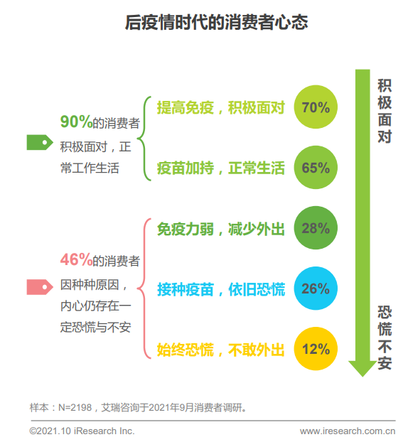 后疫情时代,出于对多次感染的担忧,消费者开始主动寻找提升免疫力的方式。艾瑞咨询发布的《后疫情时代国民健康与免疫力提升状况白皮书》显示,超九成消费者主动提升免疫力,有46%的消费者表示仍存在担忧、不安及恐慌情绪。[10]