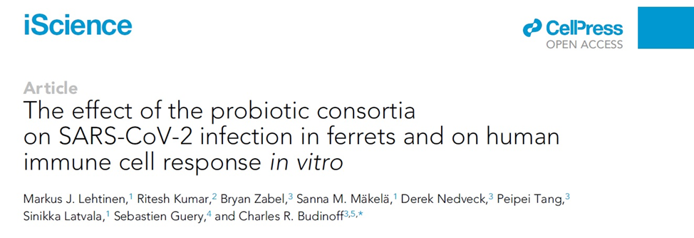 [11] Lehtinen MJ, Kumar R, Zabel B, M kel SM, Nedveck D, Tang P, Latvala S, Guery S, Budinoff CR. The effect of the probiotic consortia on SARS-CoV-2 infection in ferrets and on human immune cell response invitro. iScience. 2022 Jun 17;25(6):104445. doi: 10.1016/j.isci.2022.104445. Epub 2022 May 23. PMID: 35634575; PMCID: PMC9125999.
