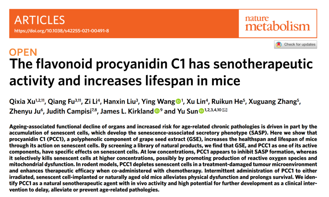 2021年汤臣倍健联合中国科学院上海营养与健康研究所、巴克衰老研究所、梅奥诊所等,从特定葡萄籽提取物中发现了突破性“抗衰老”物质——PCC1,研究结果显示其能够高效且安全地清除衰老细胞,并可延长试验小鼠寿命64.2%。[22] 基于PCC1研究成果,汤臣倍健目前尚处于相关口服产品研发及产品功效验证研究阶段。