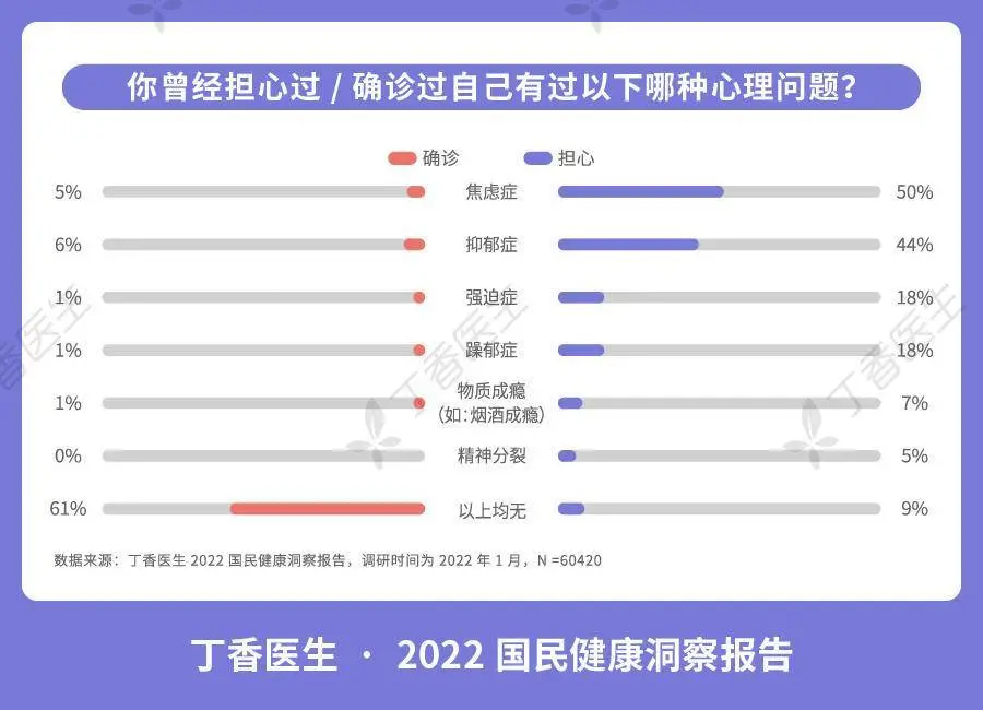 除了抑郁症和焦虑症确诊人数的增加,还有很多人主观认为自己存在心理问题。丁香医生发布的《2022国民健康洞察报告》显示,有91%的人认为自己存在心理问题,有74%的人正在采取积极的行动以应对和解决心理困扰。