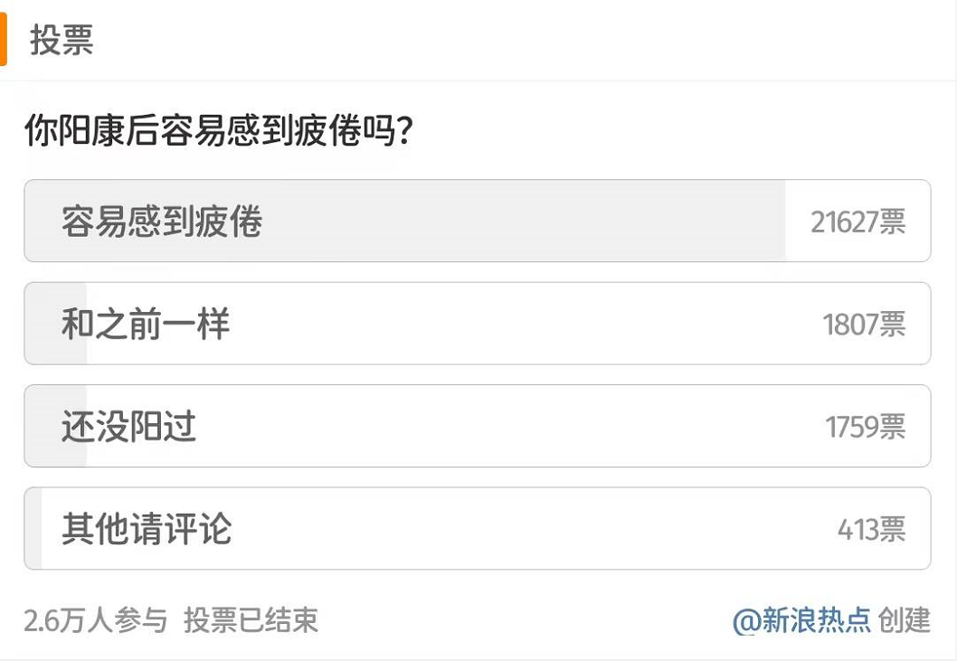 世卫组织在2022年11月更新了此前发布的《新冠肺炎个人康复指南》,其中提到:在康复过程中,可能会出现思维能力的各种困难,这种情况也被称为“脑雾”。[6] 微博上 #专家回应阳康后出现脑雾症状#的话题阅读次数达1.3亿,在2.6万人参与的投票中有21627人认为阳康后容易感到疲倦。脑袋不好使了、丢三落四、记忆力差等吐槽也经常出现在相关tag的讨论之下。