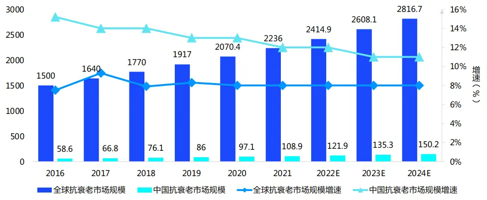 Zion Market Research数据显示,全球抗衰老市场持续增长中,年复合增长率约7.8%。Euromonitor数据显示,中国抗衰老市场2021年整体达到108.9亿美元,折合722亿人民币,实现12.15%高增长,连续3年稳定增长。中国市场增速明显高于全球市场。[19]