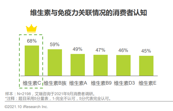 除了维生素C外,维生素A、维生素B族、维生素D3以及维生素E也都对免疫提升有促进作用。消费者也会选择购买复合维生素以快速、高效、方便地补充所需成分。根据艾瑞咨询2021年9月的调研,有72%的消费者青睐复合维生素,有60%的消费者会选择维生素和其他保健品组合。[10]