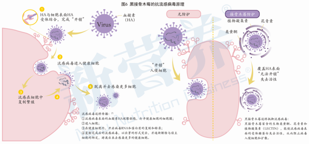 黑接骨木莓提取物被证实能够帮助防止流感病毒进入细胞内部,从而预防病毒的入侵和扩散,减少重复感染的风险。黑接骨木莓提取物同样对免疫低下引起的疾病和其他病毒性传染病有免疫调节的作用。[18]