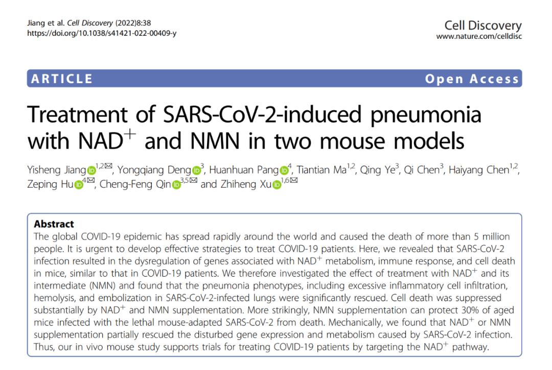 [20] Jiang, Y., Deng, Y., Pang, H. et al. Treatment of SARS-CoV-2-induced pneumonia with NAD+ and NMN in two mouse models. Cell Discov 8, 38 (2022). https://doi.org/10.1038/s41421-022-00409-y