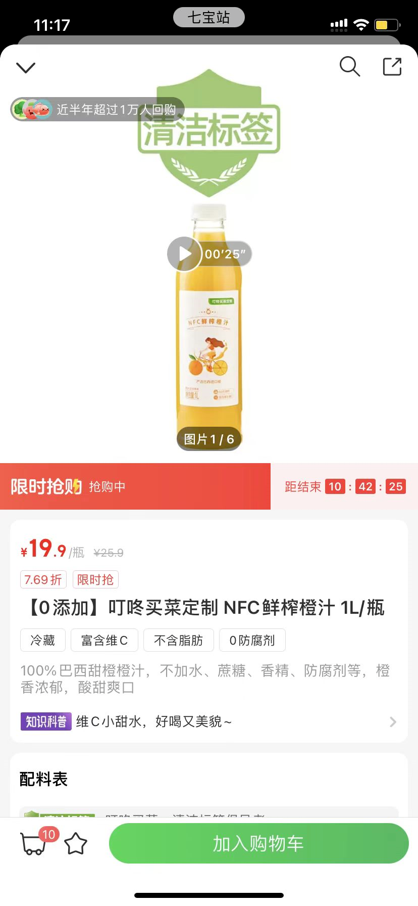 叮咚买菜平台定制的NFC鲜榨橙汁也加上了“0添加”宣传。该款果汁是用巴西甜橙作为原料制作的NFC果汁,不添加蔗糖、香精和防腐剂,配料表里只有橙汁。这款NFC鲜榨橙汁也得到了叮咚买菜的清洁标签认证。[26]