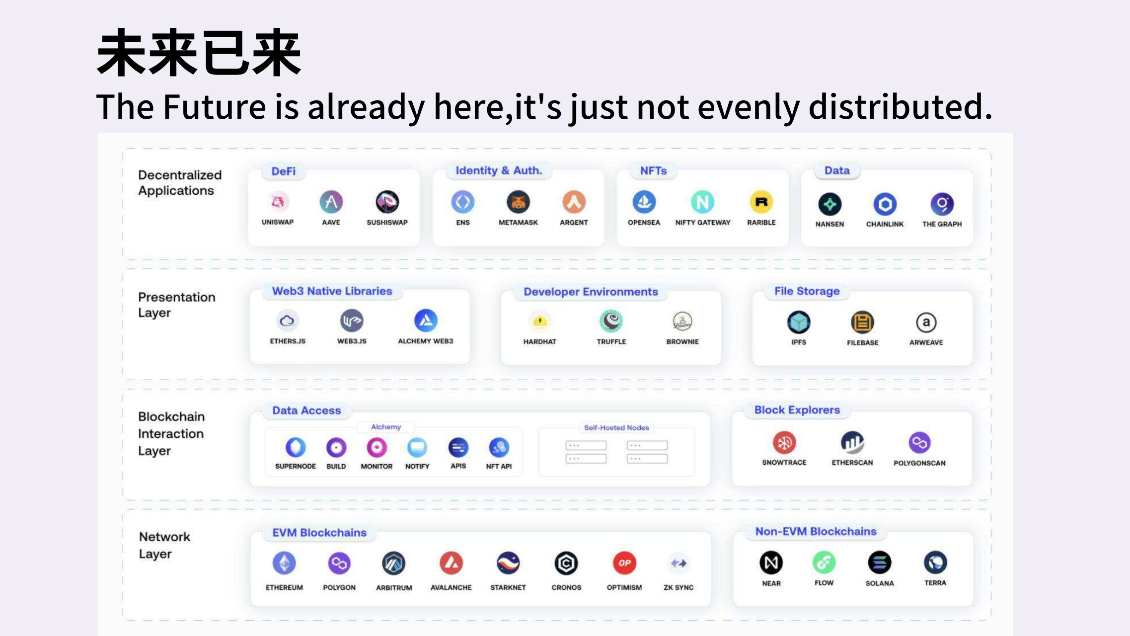 关于科技和未来,有一句话被经常引用:“ The future is already here – it's just not evenly distributed.”未来已来,只是它的分布不那么均匀。怎么理解呢?有的人在用nft,有的人在用数字藏品,有的人还停留在使用大平台的产品……所以,有些人已经在使用未来的产品,有些人仍然被束缚在过去。下面这张图展示了一些存储产品,我们现在文件的存储可能是在自己的硬盘或者是大公司提供的网盘服务器上。也有一些人开始尝试分布式和去中心化的存储,比如IPFS和Arweave等等。