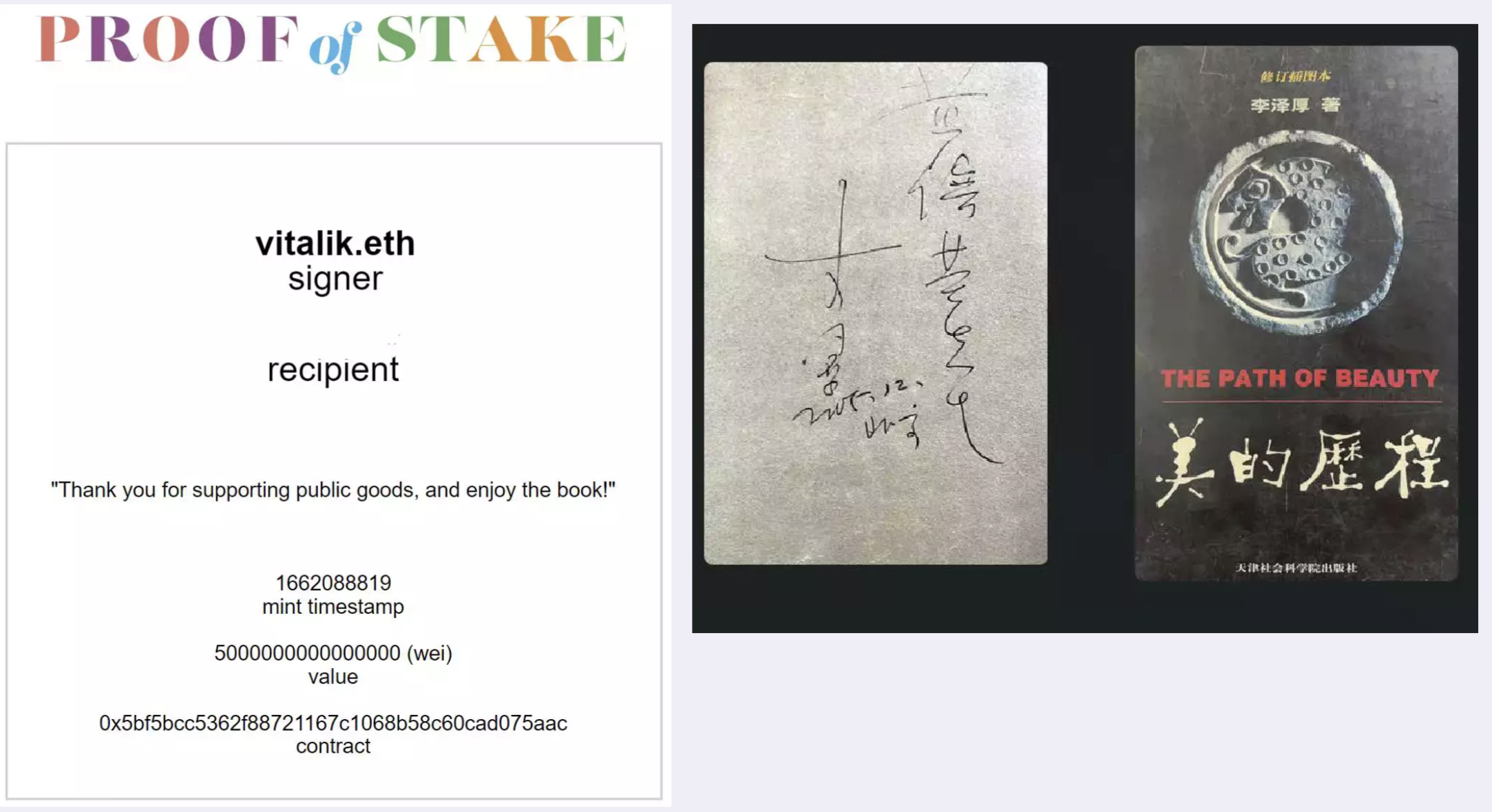 我再举一个例子。我有一本思想家李泽厚的书,20年前我采访他时,他给我签了一个名,上面写了我的名字,还有李泽厚的签名。我觉得很珍贵。这是传统实体世界的签名,在数字世界和电子书上如何实现这一点呢?这张图很多人见过,其实也是一个nft。《proof of stake》是以太坊创始人 V神(Vitalik)写的一本书,在以太坊上你可以参与一个活动,给一些赞助费,mint(铸造)一个NFT。这个NFT证明你支持过这本电子书。类比一下,在实体世界是作家给某位粉丝签名,在web3的世界,你可以通过nft来证明,你获得了作者的签名。