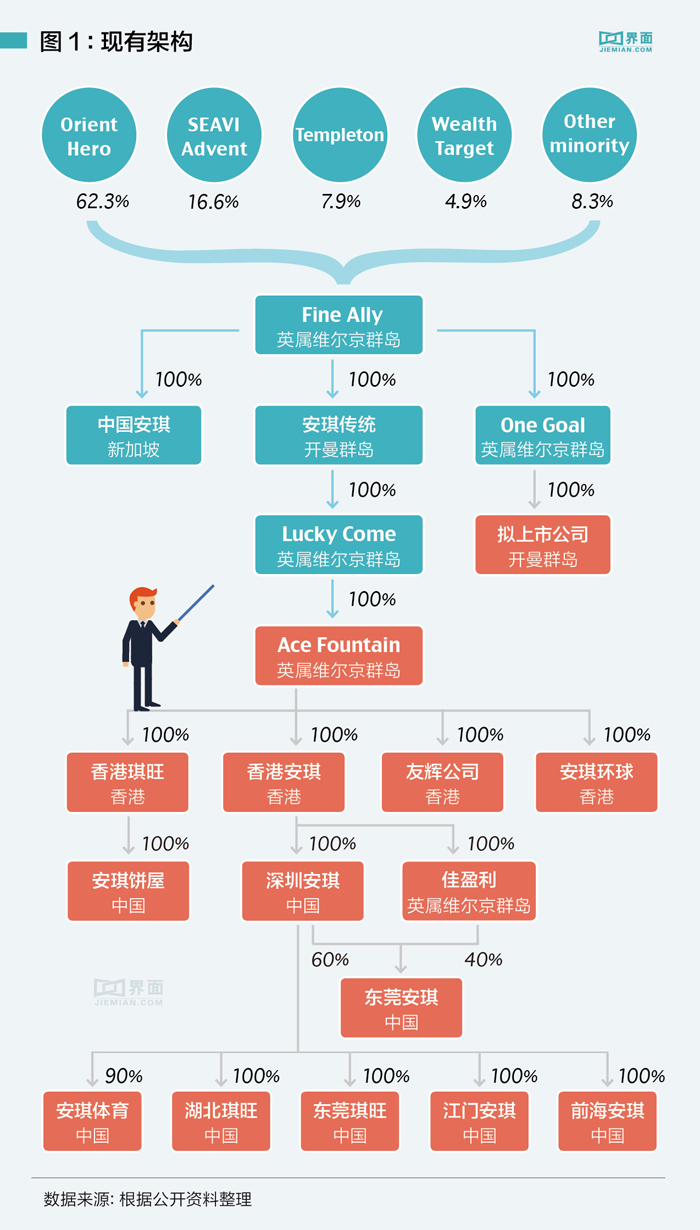 Fine Ally为英属维京群岛注册公司,该公司经多层持股安排,最终持有中国境内的深圳安琪和深圳安琪连锁饼屋有限公司(下称安琪饼屋)等境内经营实体100%的股权。梁球胜、梁翰辉和梁国进为境内各公司的实际控制人。