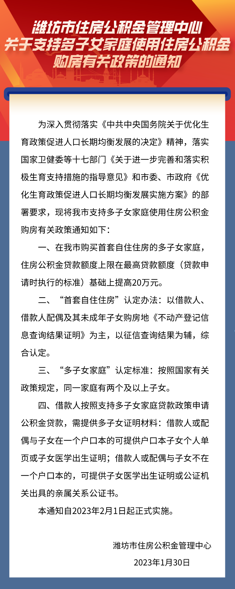 “潍坊发布”微信公众号消息,潍坊市住房公积金管理中心1月30日发布《关于支持多子女家庭使用住房公积金购房有关政策的通知》,在潍坊市购买首套自住住房的多子女家庭,住房公积金贷款额度上限在最高贷款额度(贷款申请时执行的标准)基础上提高20万元。本通知自2023年2月1日起正式实施。
