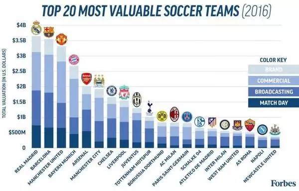 联赛赚钱,俱乐部的盈利能力也同样不差,在相对公平的财政分配政策的保证下,上赛季,出现在德勤财富榜Top20中的英超球队从6支增加到8支。更为令人震撼的是,出现在Top30中的英超球队从8支变成了14支,所有20支英超球队均出现在全球财富榜Top40。
