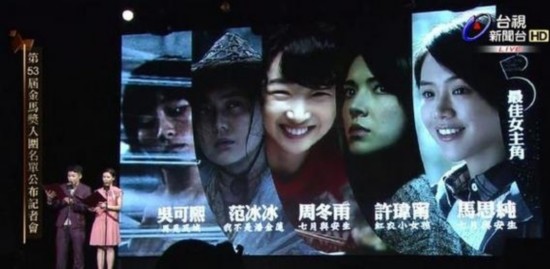 第53届金马奖提名于1日下午18:00公布,冯小刚指导的《我不是潘金莲》获得最佳剧情片、最佳导演、最佳女主角、最佳改编剧本、最佳原创电影音乐五项提名,台湾导演钟孟宏指导的《一路顺风》共提名八个奖项,成为提名最多的影片。《七月与安生》将周冬雨、马思纯送进影后的竞争,二人将与范冰冰及台湾演员许玮宁、吴可熙争夺影后。影帝方面,凭借《再见瓦城》入围的柯震东值得关注,他将与梁家辉、张学友、许冠文及范伟四位戏骨争夺影帝。