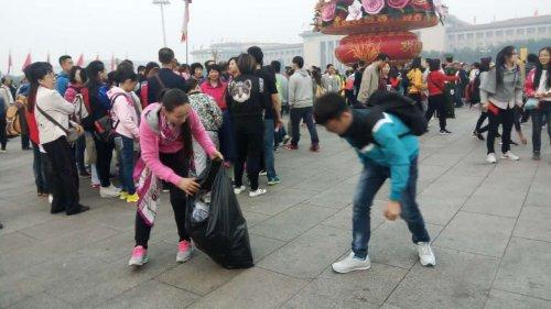 10月1日清晨6时11分,天安门广场举行了升旗仪式,大量游客前来观看,广场上一度实行分区域限流。升旗仪式结束后,广场上遗留了不少垃圾,有游客和环卫人员一起进行了清理。国民素质大有提升。