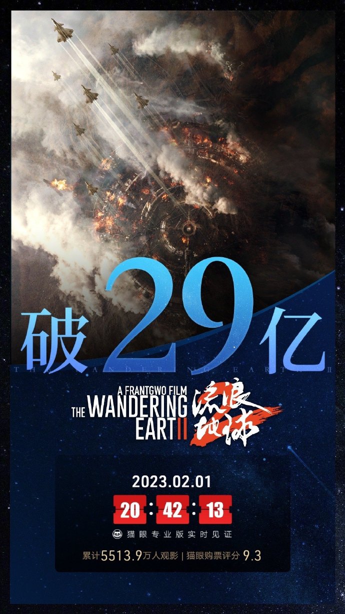 猫眼专业版数据显示,电影《流浪地球2》上映11天,总票房突破29亿元。