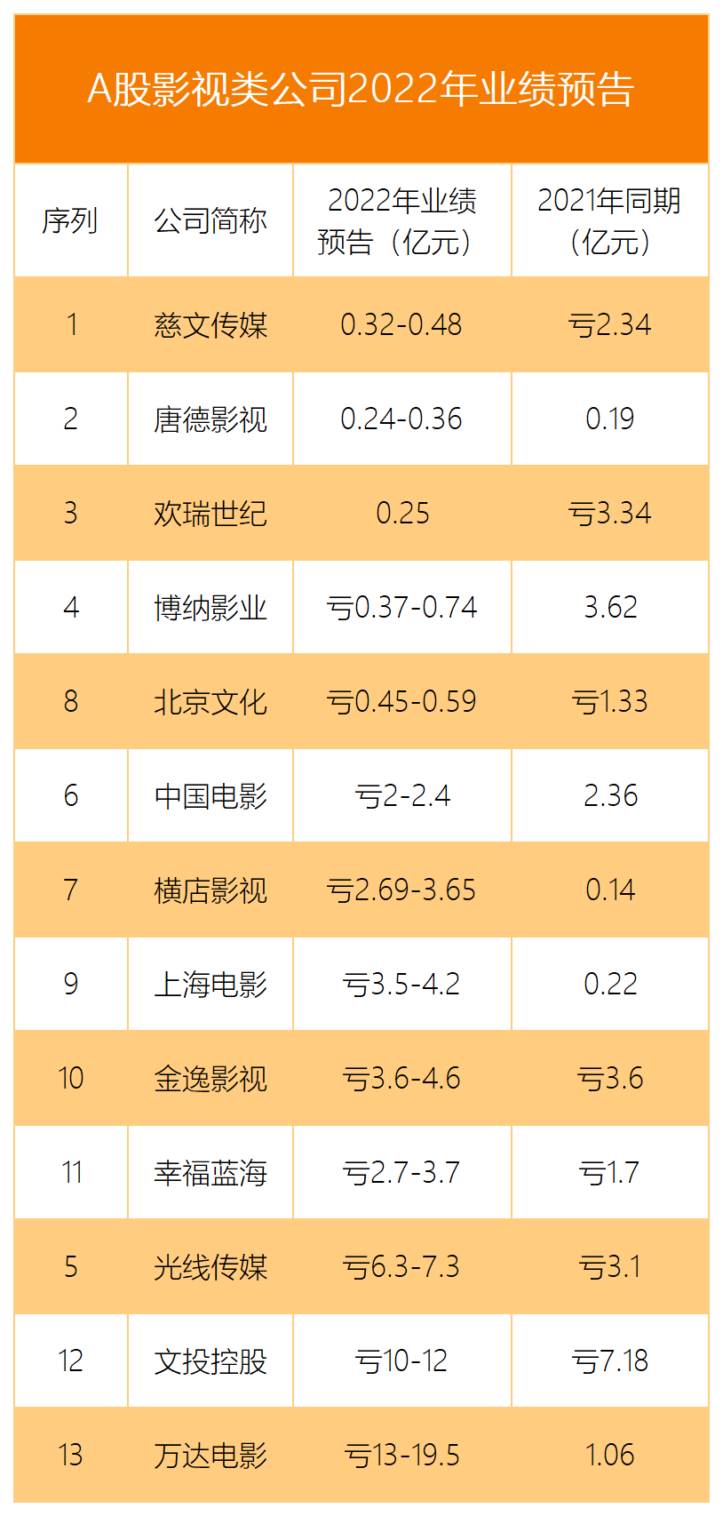 纵观这份A股影视类上市公司2022年业绩预告亏损榜单,万达的亏损是最瞩目的,预计2022年亏损13-19.5亿元,成为亏损最多的影视公司。