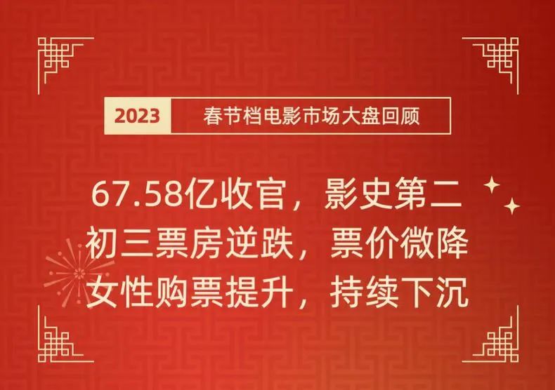 另一方面2023年春节档激烈开打,《满江红》《流浪地球2》《熊出没9》《深海》《无名》等多部风格各异、口碑在线的影片参与竞争,最终除夕至大年初六共实现票房67.58亿元,仅次2021年春节档成为春节影史票房榜No.2。