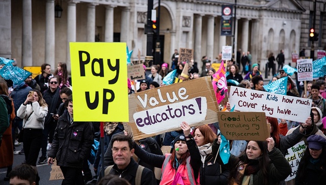 英国最大教育行业工会NEU表示,政府仅同意给工会成员涨薪5%,相当于变相降薪;英国大学与学院工会成员仅涨薪3%。英国工会联盟指责,把通胀因素计算在内,目前公务员的平均月薪比2010年还少203英镑。