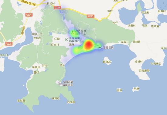 昨天上榜的海南三亚亚龙湾今天依旧排名第五。客流高峰比昨天提早一个小时,出现在15:00-17:00, 阳光、沙滩、美女,女性游客占比较昨天略有下降,依旧超过男性游客总量占比约62%。