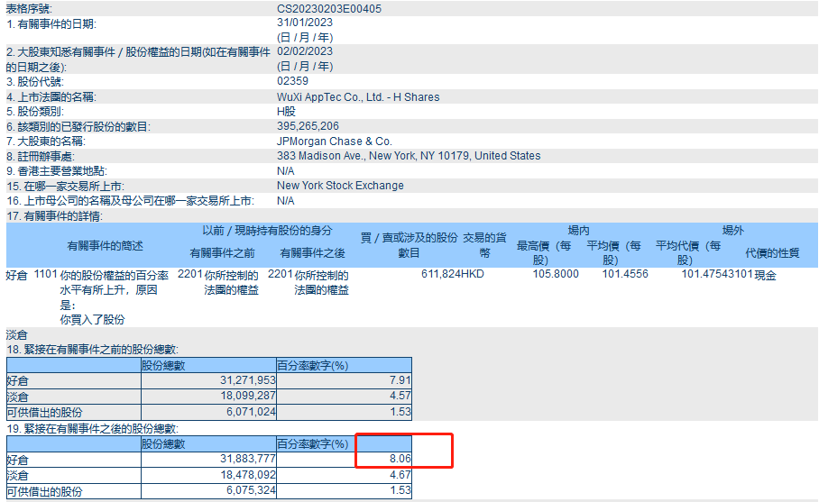药明康德:摩根大通持股比例从7.91%增至8.06%