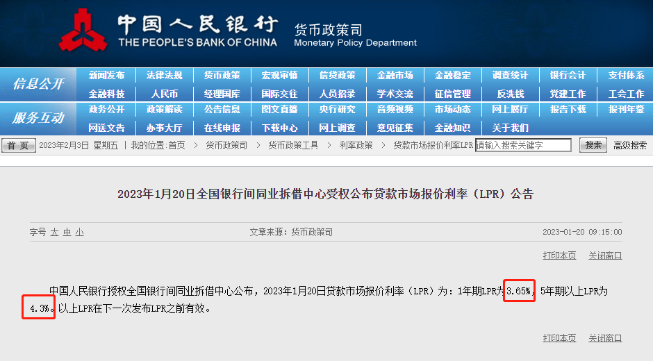 1月20日上午,中国人民银行授权全国银行间同业拆借中心公布,2023年1月20日贷款市场报价利率(LPR)为:1年期LPR为3.65%,5年期以上LPR为4.3%。以上LPR在下一次发布LPR之前有效。
