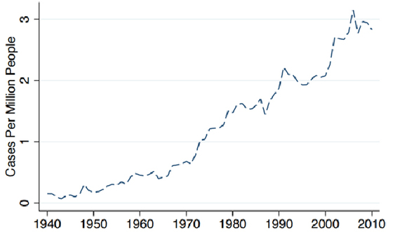 美国每百万人中,与土地使用相关案件数量变化。 来源:Hutchins Center