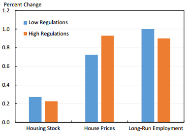 2014年,美联储经济学家摩洛(Raven Molloy)与合著者对比了劳动力需求增加对土地监管较重城市和监管较轻城市的各自影响。结果发现,土地使用监管较重城市的劳动力需求增加后,新建住房量更少、房价上涨幅度更大和长期就业率更低。