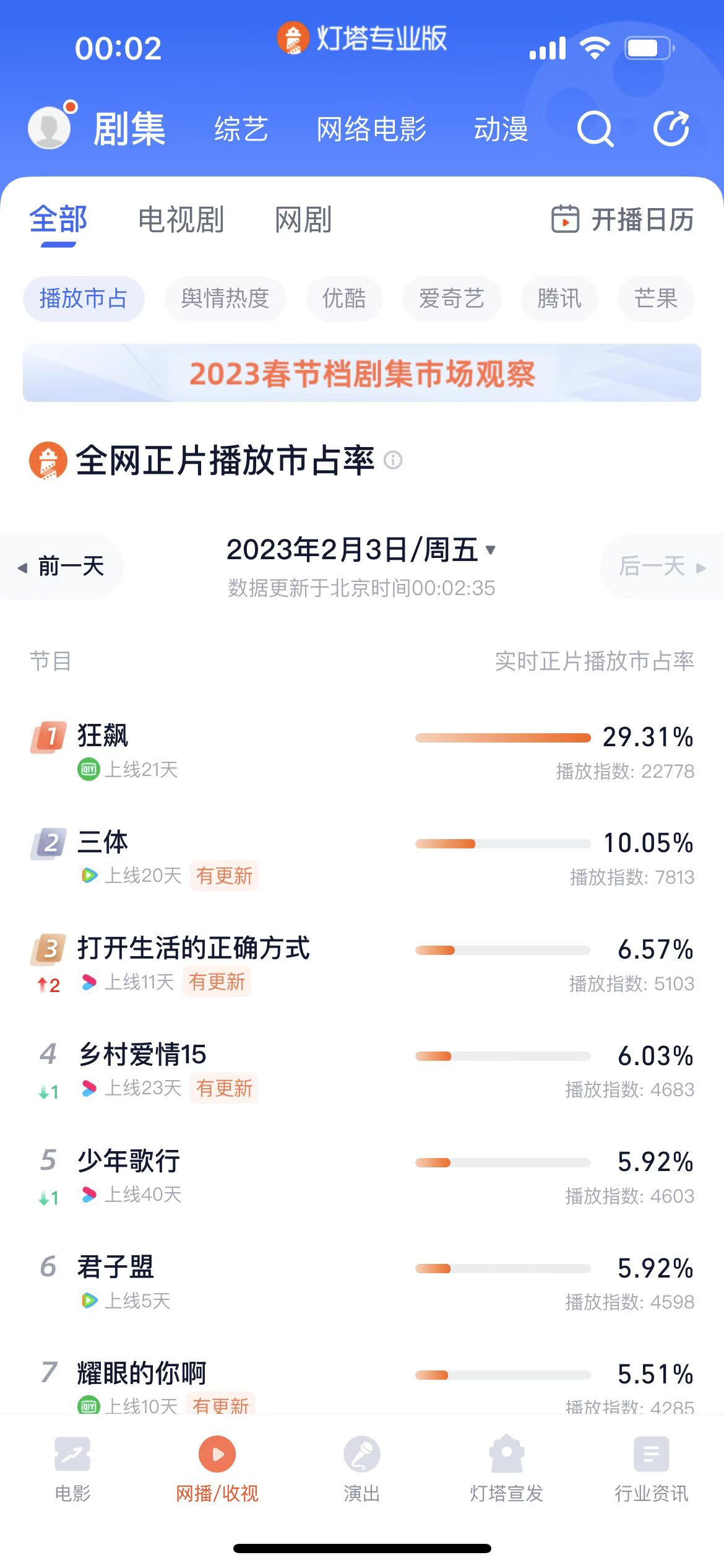 另一方面,《三体》开播初期讨论度不俗,但同期开播的《狂飙》热度发酵后以断层式优势领先。灯塔专业版数据显示,进入春节假期后,《三体》热度便落后于《狂飙》,收官两天后,2月3日《狂飙》全网正片播放市占率仍稳居第一达29.31%,而《三体》仅10.05%。