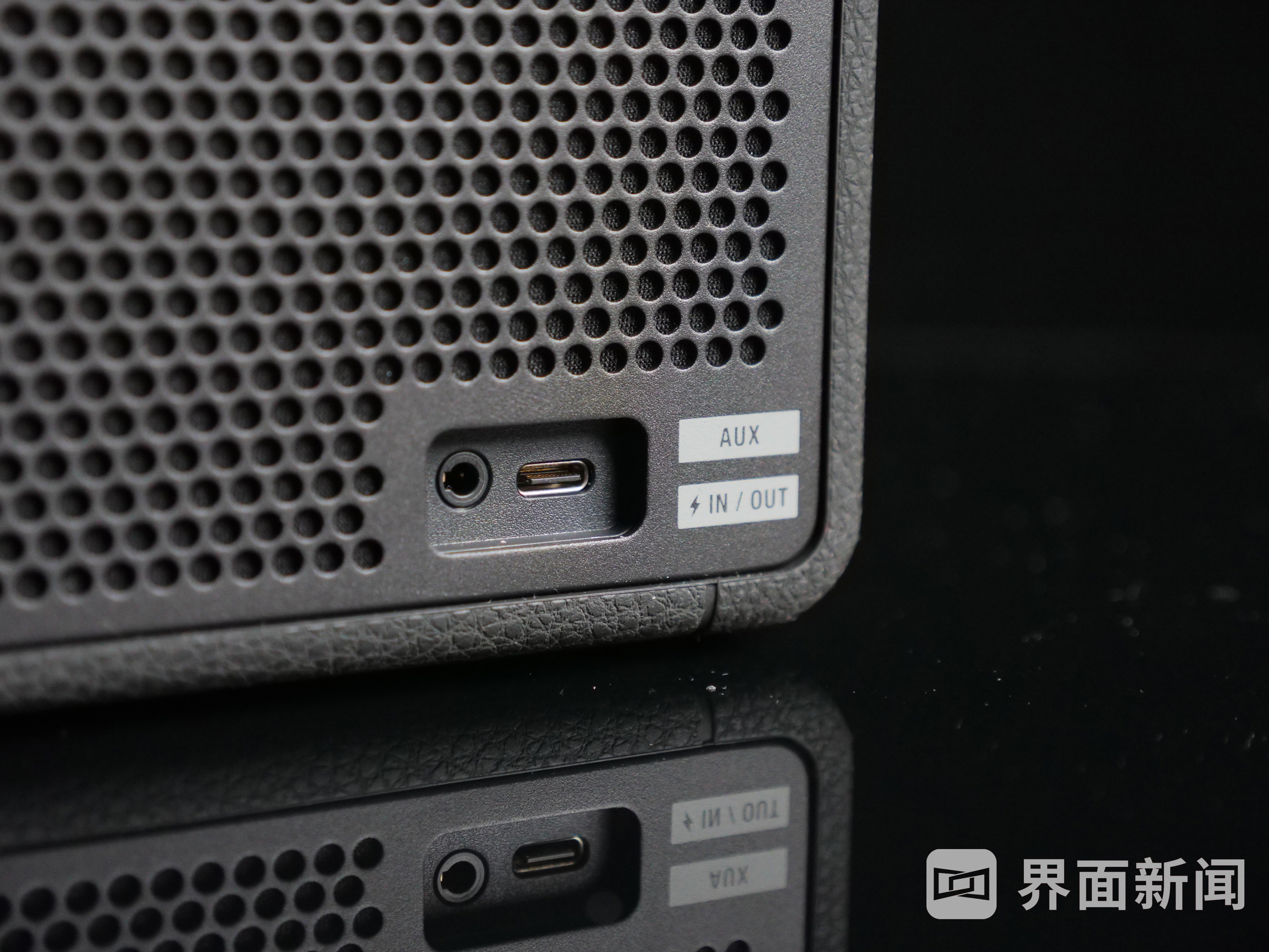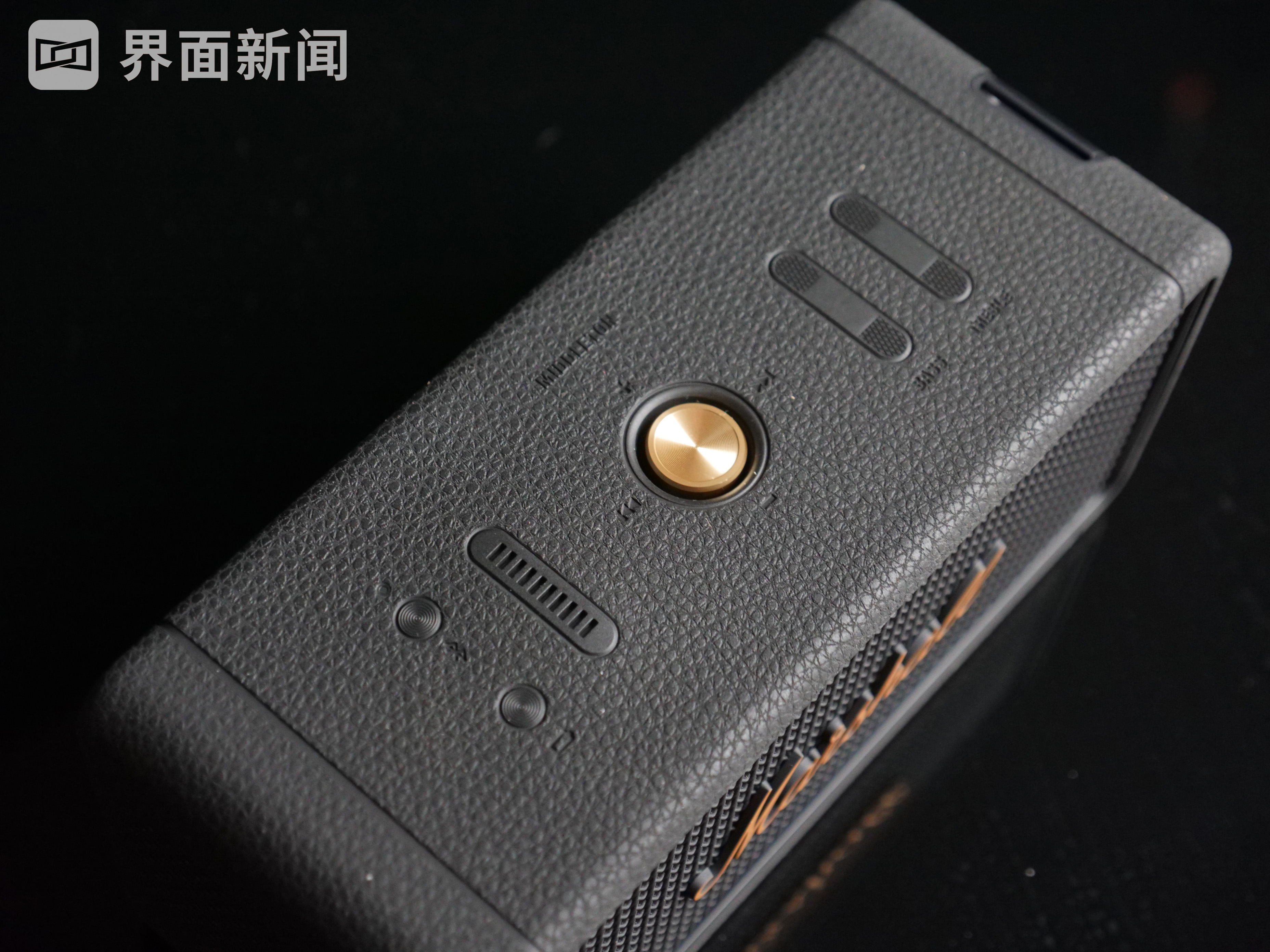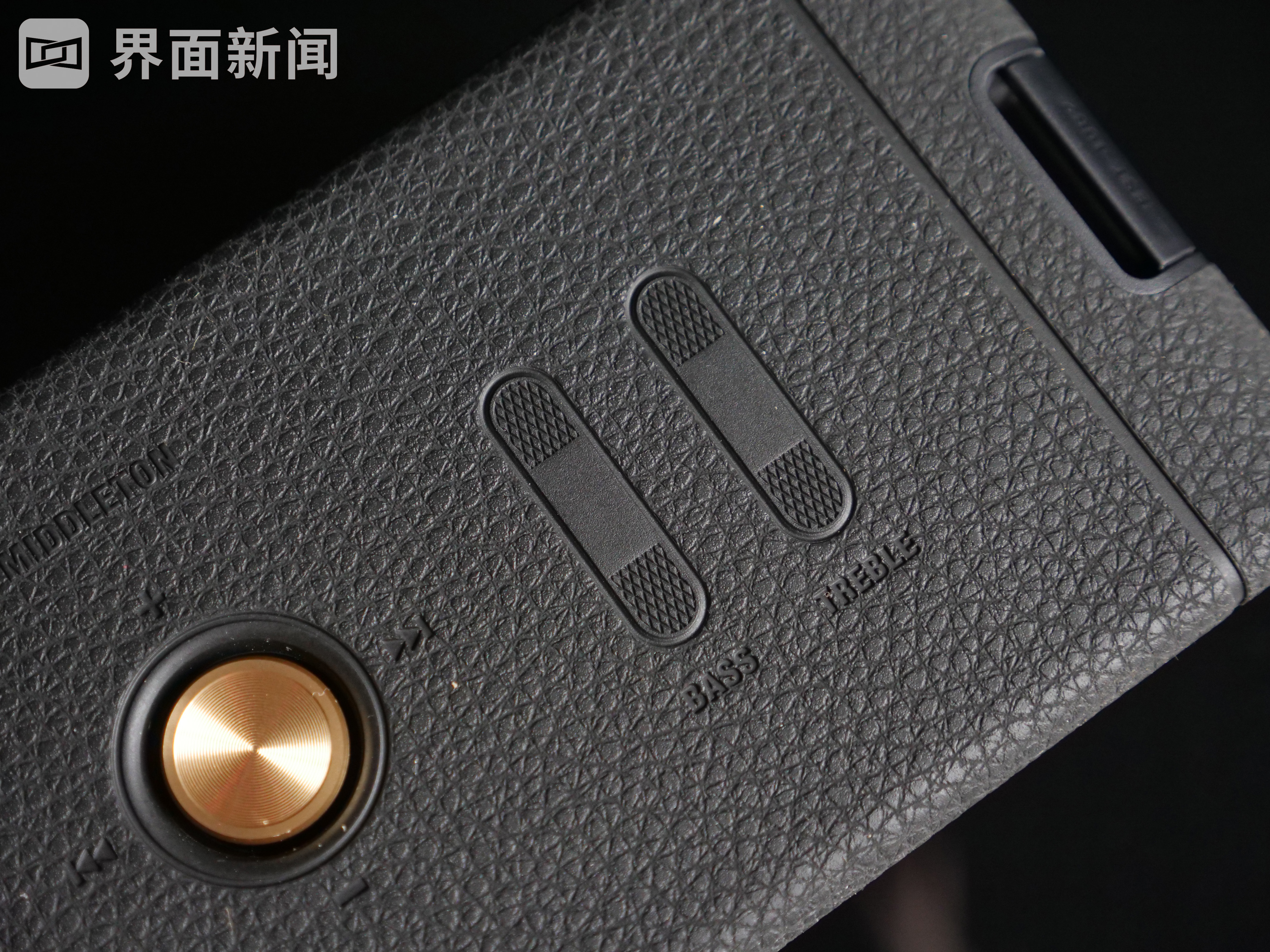 新品顶部表面为荔枝皮材质,同样为黄铜色的多功能旋钮放置在了中间,旋钮左侧为蓝牙配对按钮,右边则是高低音调节按键。