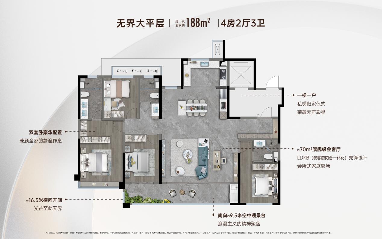 约188㎡无界大平层,横向开间达到约16.5米,并造出约70㎡旗舰级会客厅。它将成为你商务场上的私人会所,也能成为你人生的岁月收藏馆,陪伴记录每一刻的成功与欣喜。约9.5米超长阳台,不仅让采光与通风达到极致,更打开N种生活体验。放上一台跑步机,成为燃烧卡路里的赛场;若移上几方木架,便是温暖的花房。