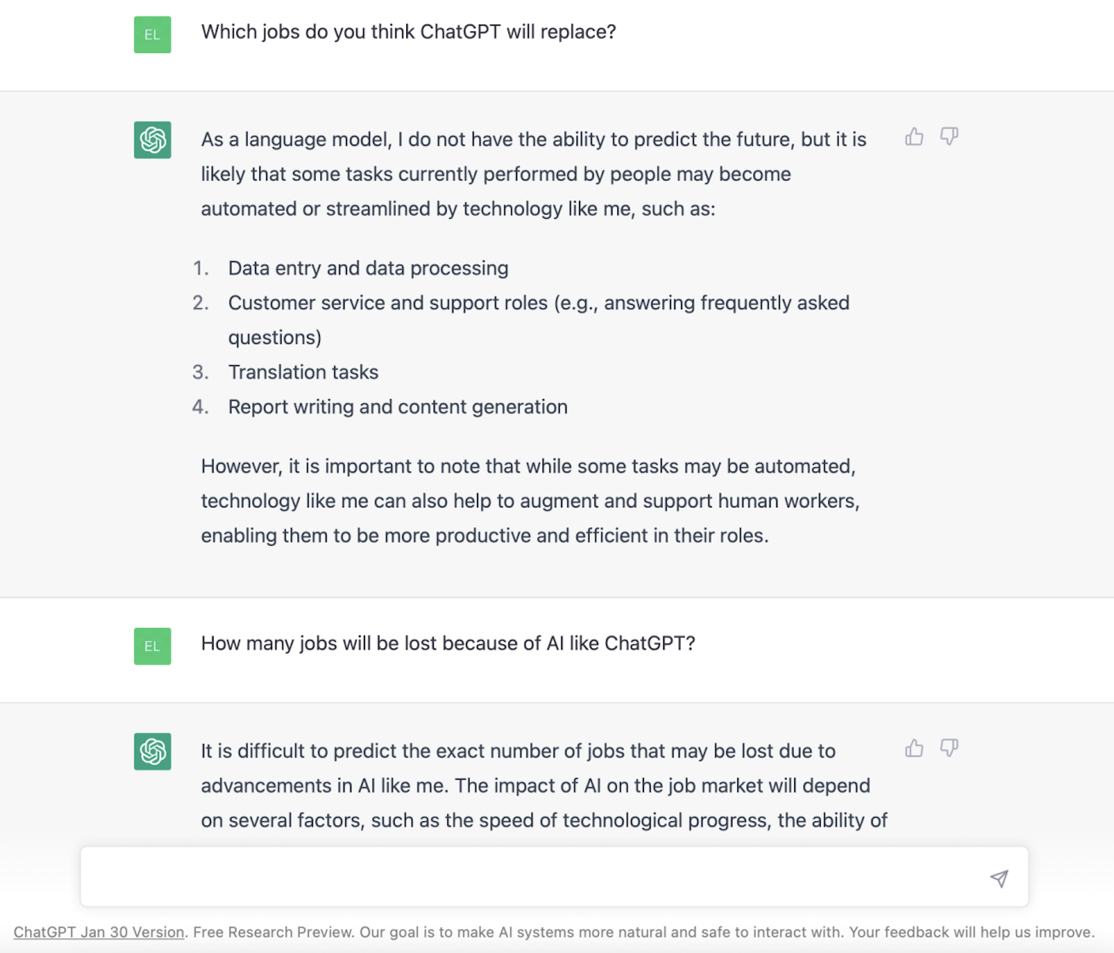 ChatGPT还为自己辩护到,重要的是要注意,虽然某些任务可能变成了自动化,但像我这样的技术也可以为人类工作者提供帮助和支持,提高他们的生产力和效率,并对就业市场产生“净积极”的影响。