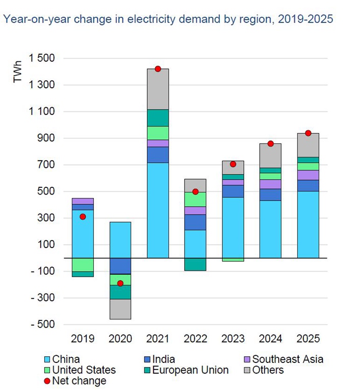 IEA预测,今后三年中,中国的用电需求平均年度增幅将达到5.2%,印度为5.6%,欧盟恢复至1.4%。