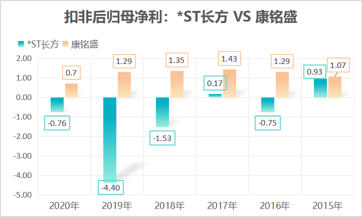 长方集团原有的业绩实际已连续多年亏损。根据界面新闻记者的统计,在2015年至2020年,扣除康铭盛这一子公司的贡献,在2015年至2020年长方集团原有业务扣非后归母净利少则亏损0.14亿元多则亏损5.7亿元,原有业务6年内累计亏损13.37亿元。