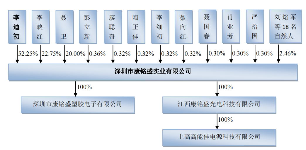 在被收购前,康铭盛在江西、深圳拥有3家子公司,分别是江西康铭盛光电科技有限公司(下称江西康铭盛)、深圳市康铭盛塑胶电子有限公司、上高高能佳电源科技有限公司 ,主营业务均为便携式 LED 移动照明产品的生产和销售 。