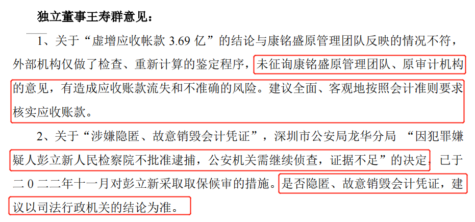 界面新闻记者也发现在2023年2月1日《关于对深交所关注函回复的公告》中,长方集团独立董事王寿群表示,关于“涉嫌隐匿、故意销毁会计凭证”,深圳市公安局龙华分局 “因犯罪嫌疑人彭立新人民检察院不批准逮捕,公安机关需继续侦查,证据不足”的决定,已于 2022年11月对康铭盛原财务总监彭立新采取取保候审的措施。是否隐匿、故意销毁会计凭证,建议以司法行政机关的结论为准。