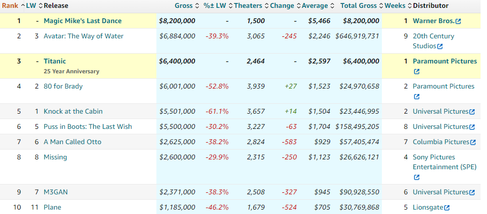 《魔力麦克3:最后之舞》以约820万美元首映周末票房拔得头筹。《阿凡达:水之道》以约688万美元周末票房从上期榜单第三位升至本轮排名次席,目前北美累计票房近6.47亿美元,位列北美票房总排行榜第10名;加上海外市场,该片迄今总票房逾22.13亿美元,居全球票房总排行榜第4位。《泰坦尼克号》10日重返大银幕,以约640万美元周末票房摘得本期榜单季军。