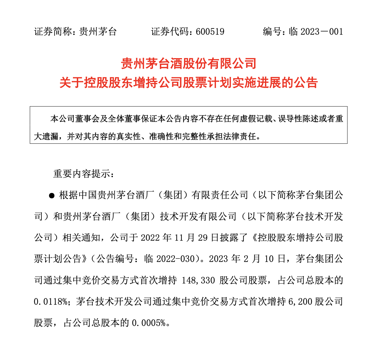据了解,去年11月底,贵州茅台发布了《控股股东增持公司股票计划公告》。根据公告显示,贵州茅台股东茅台集团、茅台技术开发公司计划利用公司特别分红所得现金红利,自公司特别分红现金红利发放之日起6个月内,通过集中竞价交易增持公司股票,两家股东合计增持金额不低于15.47亿元,不高于 30.94 亿元。