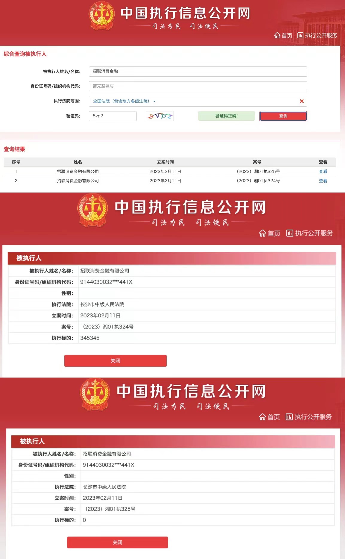 据中国执行信息公开网披露,2月11日,湖南省长沙市中级人民法院对招联消费金融两条执行申请进行立案。在案号为(2023)湘01执324号案件中,招联消费金融有限公司的执行标的为34.5345万元;在案号为(2023)湘01执325号案件中,招联消费金融有限公司的执行标的为0元。