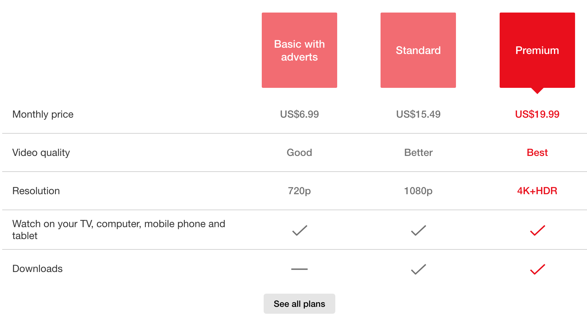 不同的是,Netflix从诞生之初就是无广告模式,去年11月为了增加会员、提高营收,也开始上线低价的广告订阅计划(Basic With Ads),该计划平均每小时会有4至5分钟的广告,每月的付费价格仅为6.99美元/月,低于此前最基础的9.99美元/月价格。