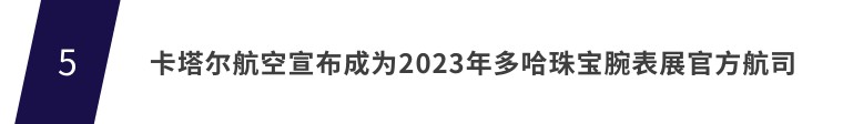卡塔尔航空宣布成为2023年多哈珠宝腕表展(DJWE)的赞助商,作为卡塔尔年度社交日历中持续时间最长和最令人期待的盛事之一,该活动每年在海湾地区举行,以其独有的B2C模式吸引预计超过30,000名来自世界各地的游客齐聚卡塔尔。2月20日至25日,为期6天的多哈珠宝腕表展将于卡塔尔多哈会展中心举行。届时,观展者可欣赏到来自500多个全球知名珠宝腕表品牌独具匠心的精湛工艺。