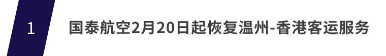 2月20日起,国泰航空将恢复每周三班往来温州与香港的客运航班服务,这将是国泰航空恢复的第十四条内地航线。重新启航的温州与香港客运服务将于每周一、四、五营运,采用空客 A321neo客机执飞。A321neo为国泰航空单通道机队的新成员,配有专为短途航线而设计的崭新公务舱及经济舱座椅,所有客舱亦都配备 4K 超高清个人电视屏幕,为旅客带来焕然一新的飞行享受。目前,旅客搭乘国泰航空前往香港,持有出发前48小时核酸检测阴性证明,并填写相关健康申报,即可享顺畅的“通关”流程。