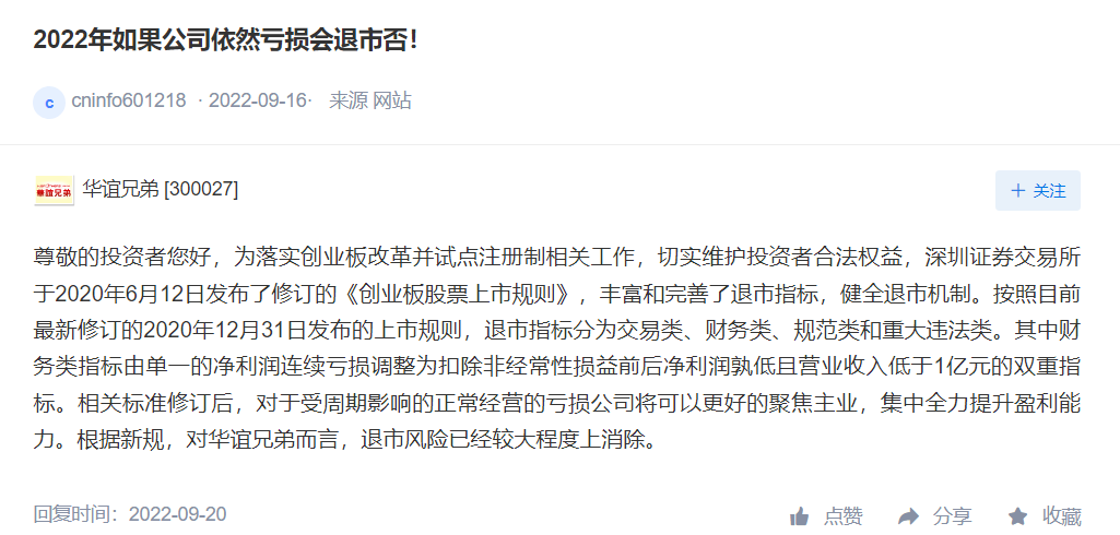 从2018年至2021年,该公司已经分别净亏损11.69亿、39.78亿、10.48亿元和2.46亿元,四年亏损总额超64亿元。这组数字曾引发“退市”担忧。早在去年9月份,就有投资者在投资者互动平台向华谊提问:“2022年如果公司依然亏损会退市否?”当时华谊回复称,按照目前最新修订的上市规则,公司“退市风险已经较大程度上消除。”