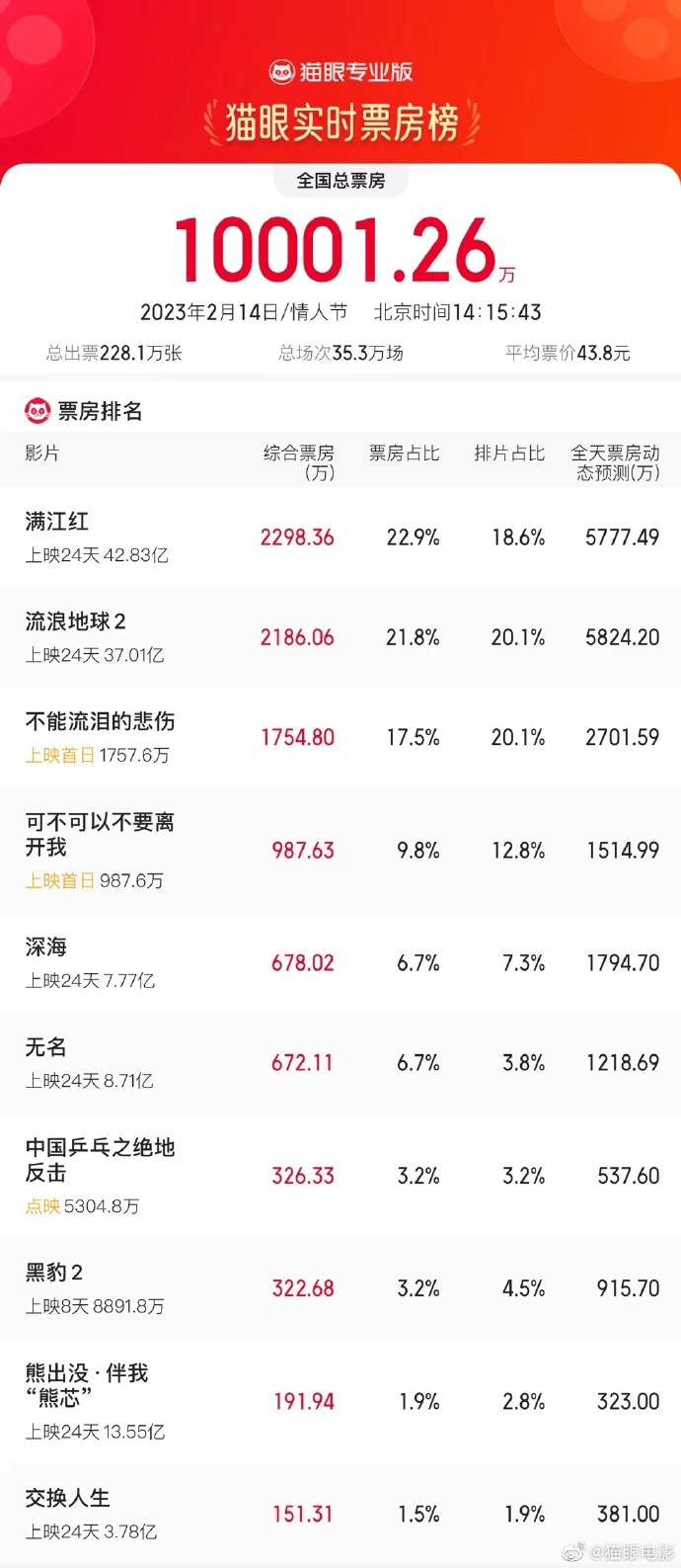 据猫眼专业版数据,2023年2月14日14时15分,2023年情人节(2月14日)总票房破亿,《满江红》《流浪地球2》《不能流泪的悲伤》分列单日票房前三位。