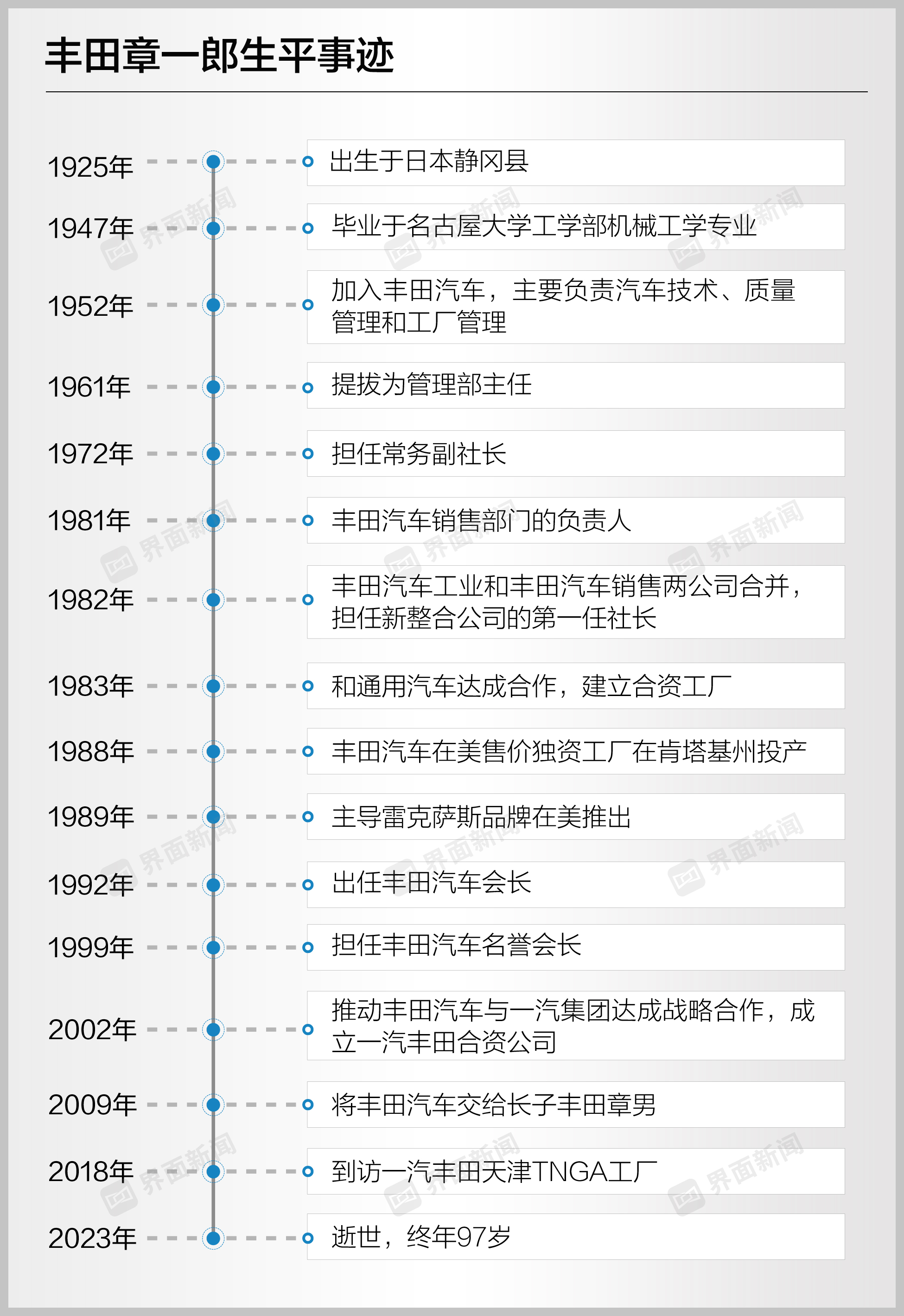 丰田章一郎在1952年加入家族企业丰田汽车,1982年成为丰田掌舵人。在此后近20年的时间里,丰田章一郎带领这家日本汽车制造商进军北美制造业,并主导推出了豪华品牌雷克萨斯和混动车型普锐斯,前者在华销量连续17年增长,后者累计全球销量已超过500万辆。