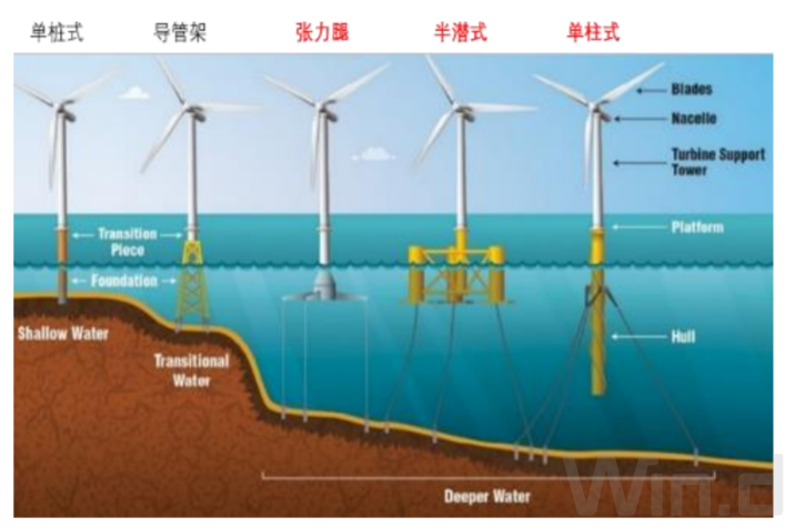 原因是来自漂浮式海上风电的崛起。在风电领域,海风具有风力更大、土地资源成本低、离东部沿海高用电负载地区较近等优势。随着海风装机量不断上升,漂浮式海上风电将会成为未来风电发展的重要方向。相较于原先固定式海上风电的建造成本随着水深增加成指数级形式增长,漂浮式海上风电则不会遇到同等情况,成本呈线性增长相对较低。叠加近海资源愈发紧张,未来开发深水远海资源时漂浮式技术的广泛应用将成趋势。