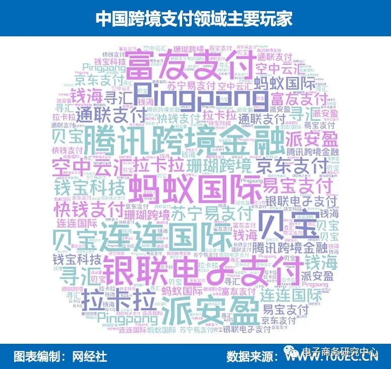 据网经社企业库(COP.100EC.CN)显示,当前,跨境支付类中的玩家包括:蚂蚁国际、腾讯跨境金融、连连国际、银联电子支付、PingPong、派安盈、富友支付、贝宝、拉卡拉、空中云汇、京东支付、通联支付、易宝支付、钱宝科技、快钱支付、苏宁易支付、寻汇、钱海、珊瑚跨境等。