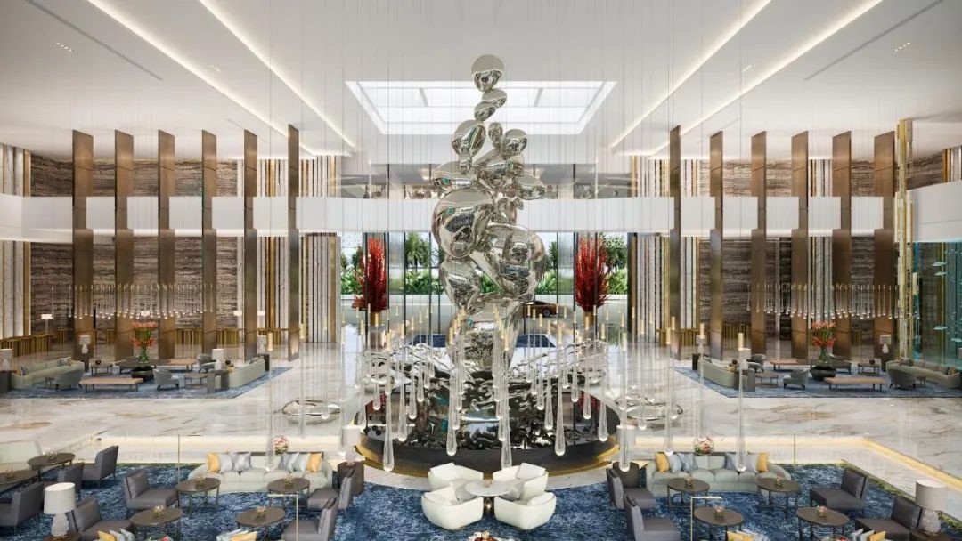 室内设计则由GA Group负责,设计灵感来自阿拉伯沙漠中的一支古老民族。大堂正中央矗立着一座11.5米高的雕塑,名为“水滴·Droplets”,寓意沙漠中的雨水,与天花板上的雨滴灯饰遥相呼应。大堂酒吧区还有世界上最大的水母缸,两千多只水母在其中遨游。