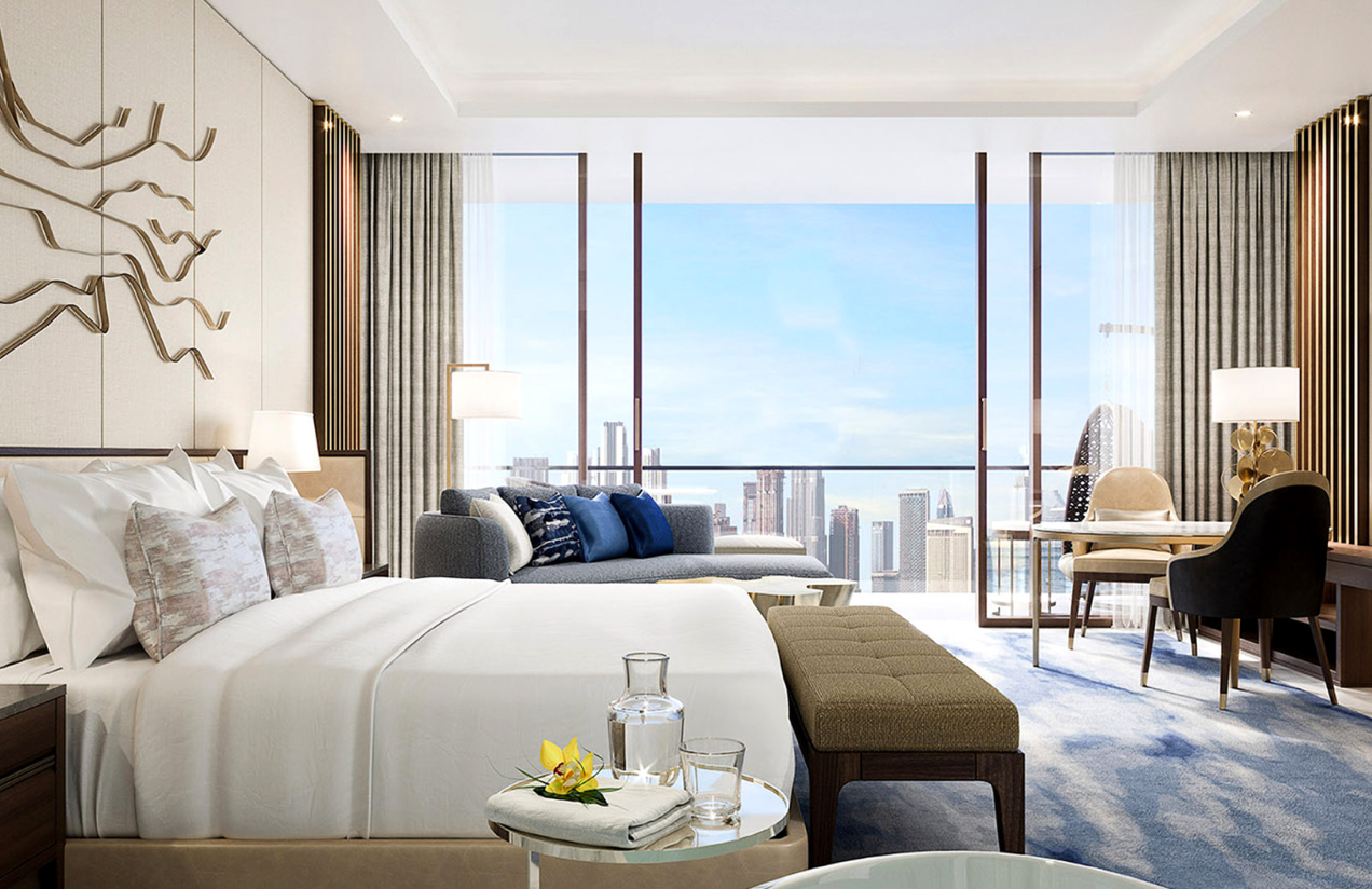 酒店高达43 层,拥有795间客房,其中102间为套房。房间以金色为主色调,就连洗漱用品都是镀金,很具有迪拜的奢华特色。每间客房的照明材质及手工雕刻的纹理呈现当代时尚风格,并设有Graff和 Frette为酒店专属定制的设施,以及 Hypnos 手工缝制的床垫。此外,酒店还可以提供各种连通选择,包括私人独享整个楼层。
